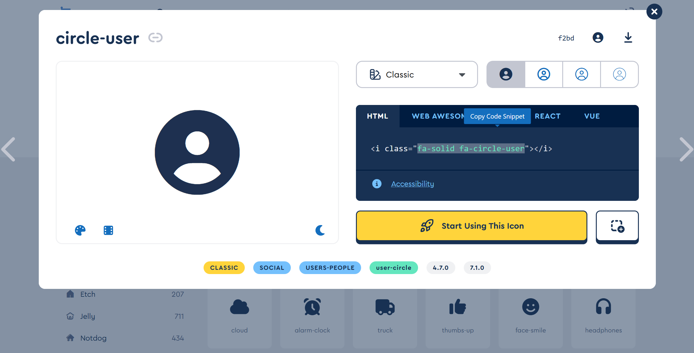 FontAwesome图标名称查询:打开链接:https://fontawesome.com/search,如下图,选择一个图标点击打开,将class=" "引号里面的内容复制出来即可。