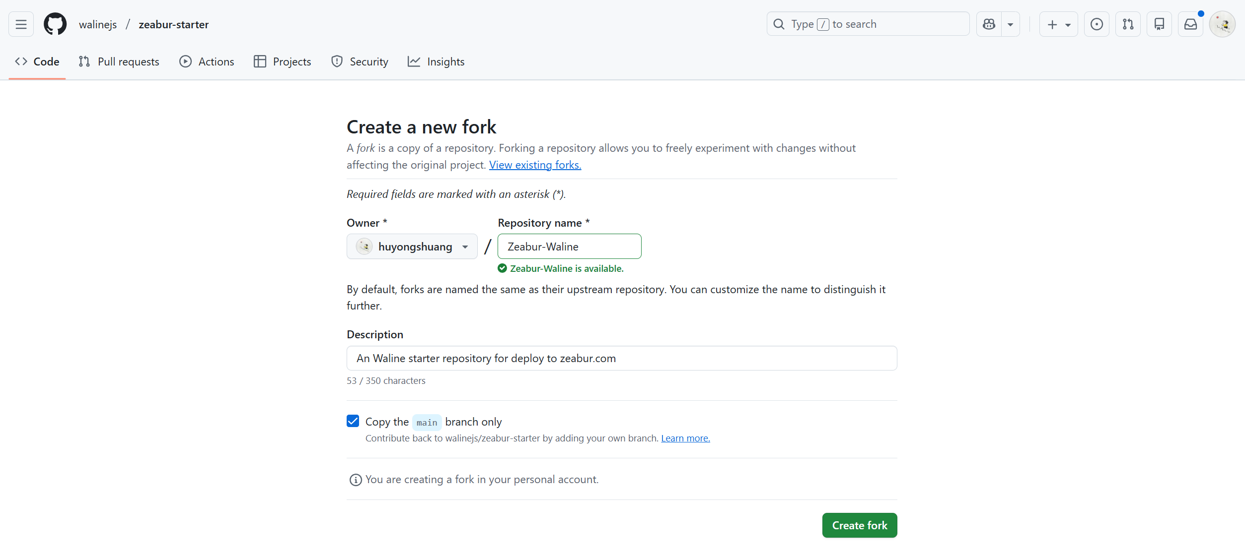 (1)点击链接:https://github.com/walinejs/zeabur-starter/fork,创建Zeabur启动脚手架。在Repository name处填写上仓库名后,点击Create fork创建。