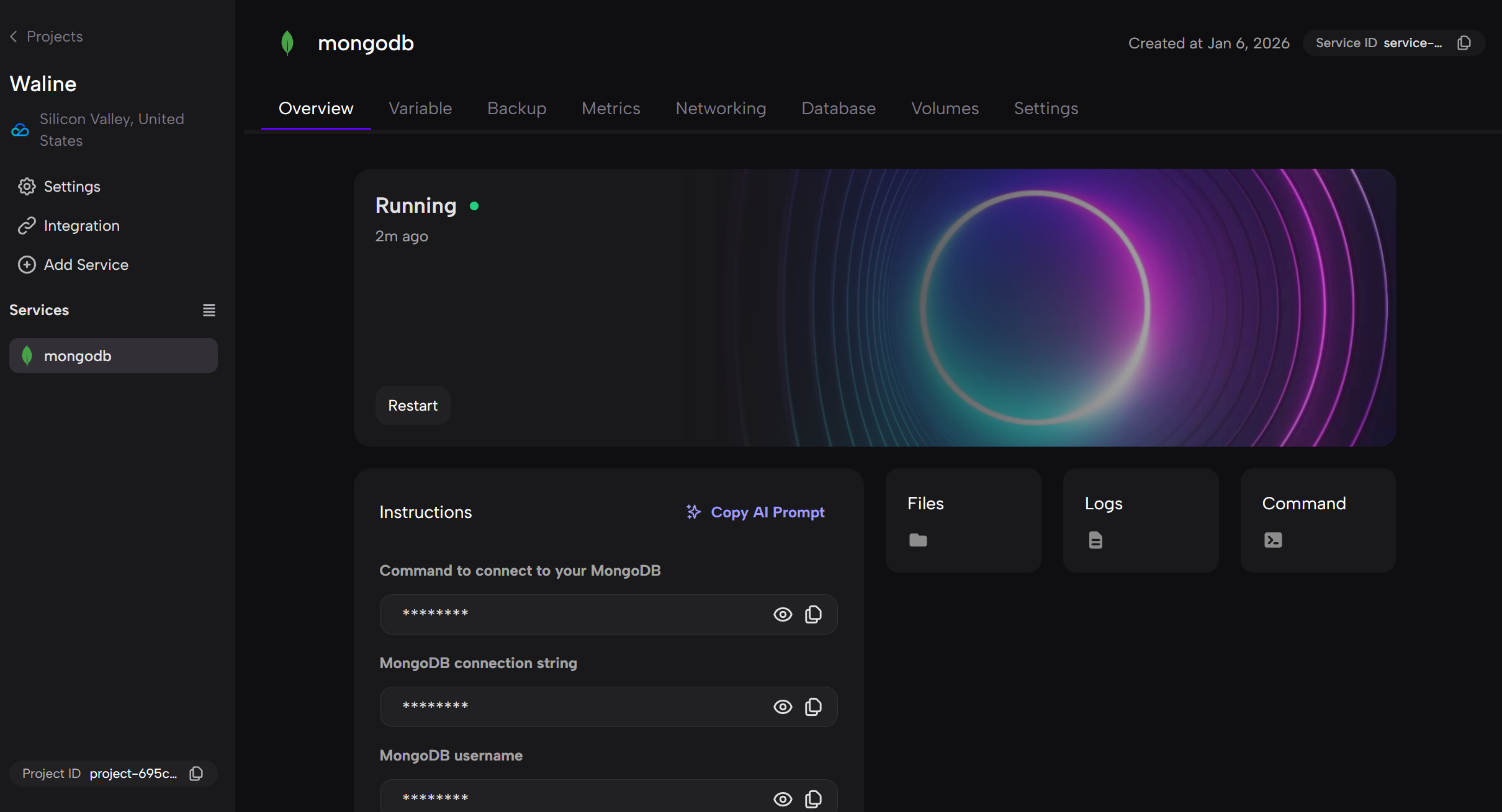 (3)点击Deploy New Service部署新服务,选择Databases,再选择MongoDB,数据库服务就部署好了。