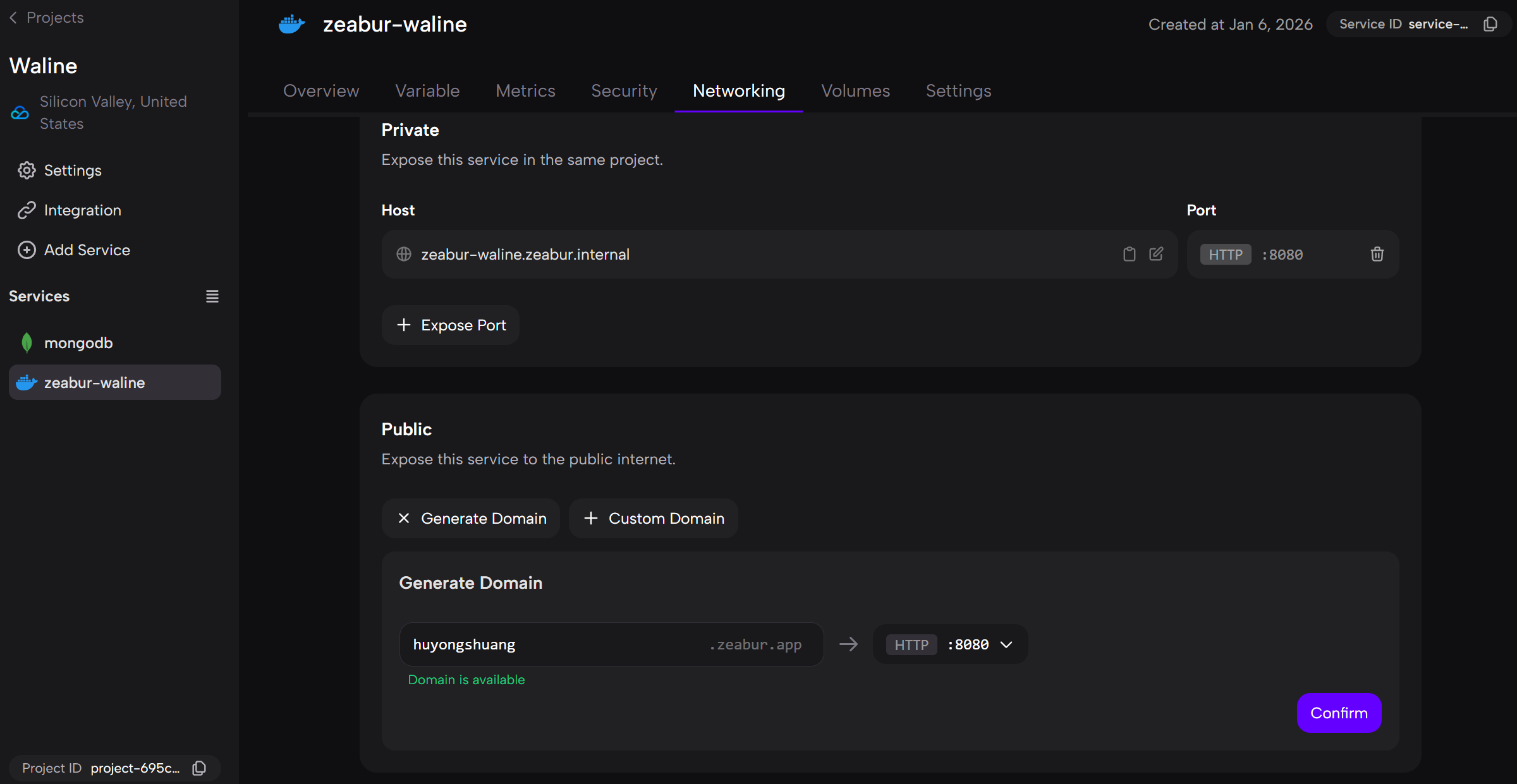 (5)最后给服务添加访问域名<serverURL>,左侧选择刚刚创建的Waline服务,右侧点击Networking选项卡下的Generate Domain按钮,输入自己想要的域名前缀并点击Confirm,就添加好访问域名了。