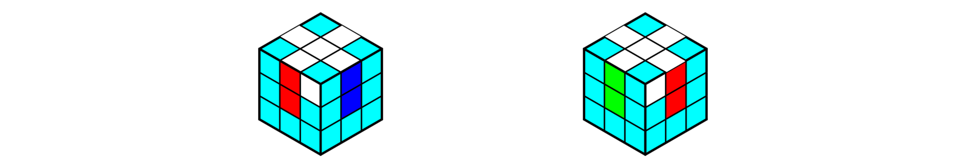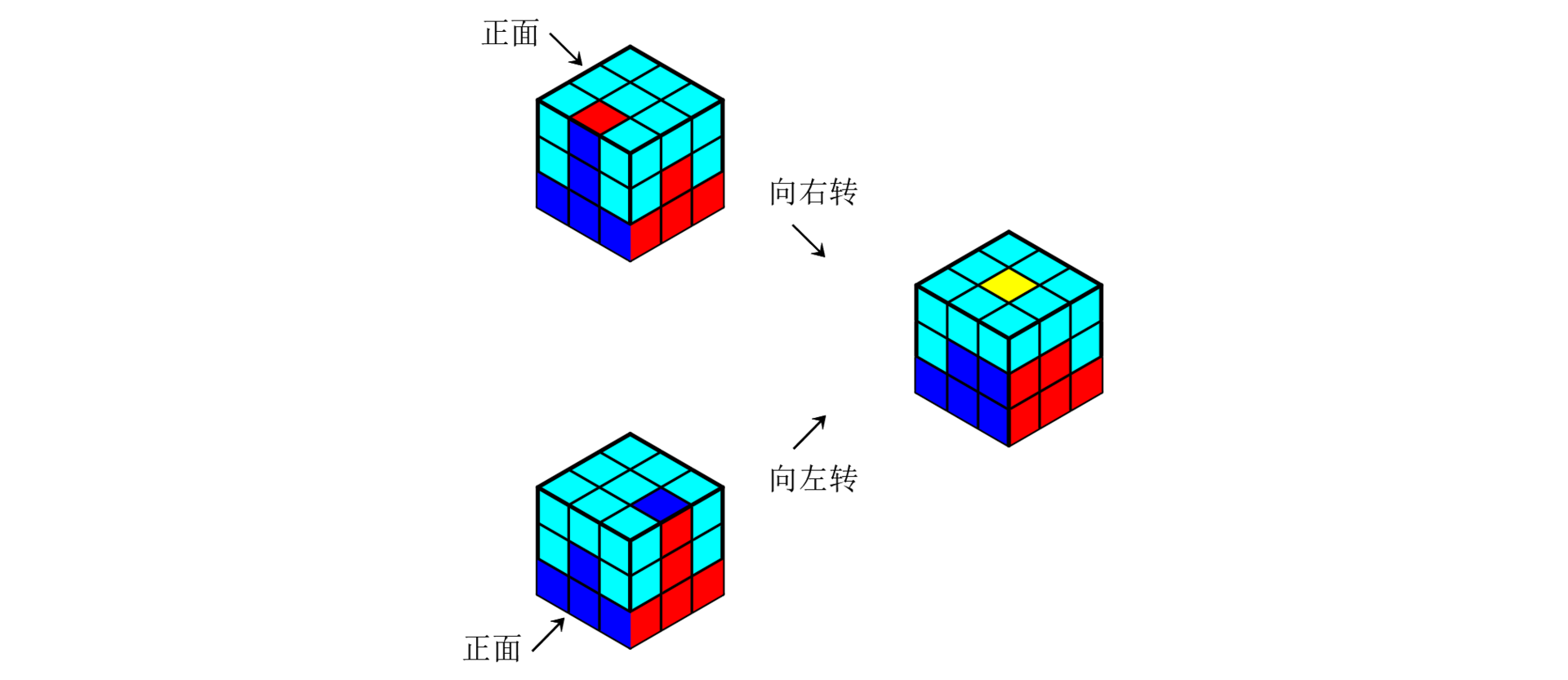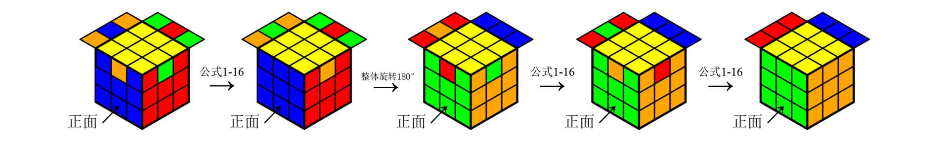 - 如果顶层侧边不存在中棱颜色与左右两角块颜色相同的面,就将任意一个面作为正面,使用公式1-16后,会出现顶层侧边颜色对齐的一个面,把这一面的背面作为正面,使用公式1-16还原。