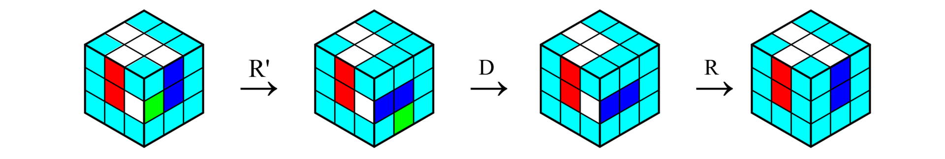 - 找到颜色为白色和与侧边中心颜色相同的颜色的棱块,只使用公式R、F、B、D(和其逆)将其移动到顶面,注意不要打乱已经与侧边中心对齐了的棱块;
