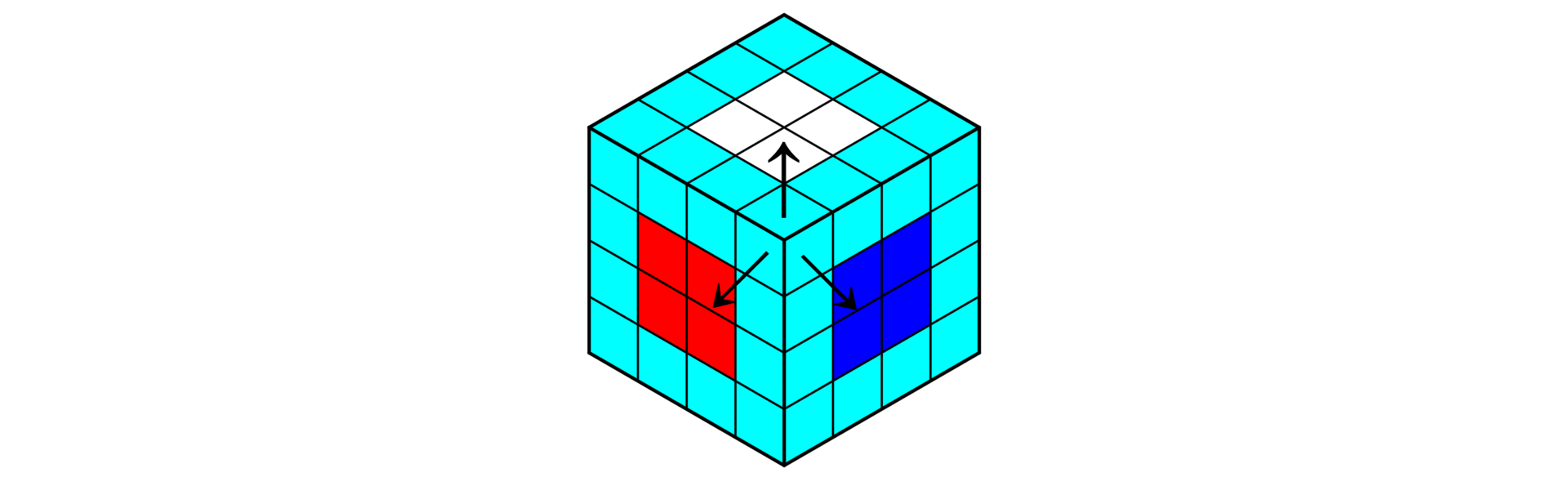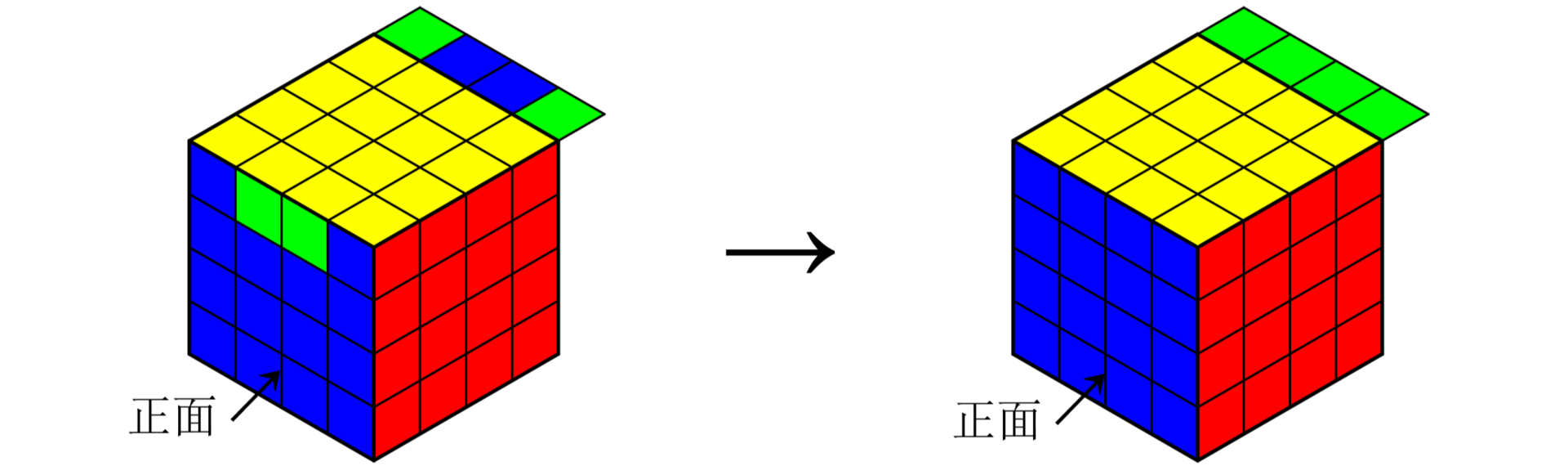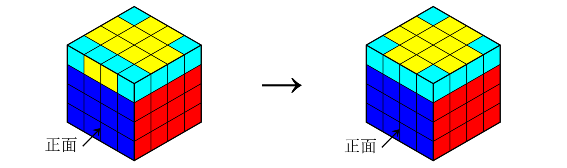 - 若最后一个块位于第一个面的背面,则按照上述方法,使用两次公式3-1,把最后一个块先从背面移动到相邻的侧面,再移动到上述第一个面还原第一个中心块。