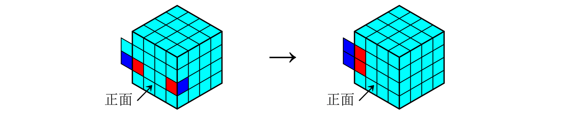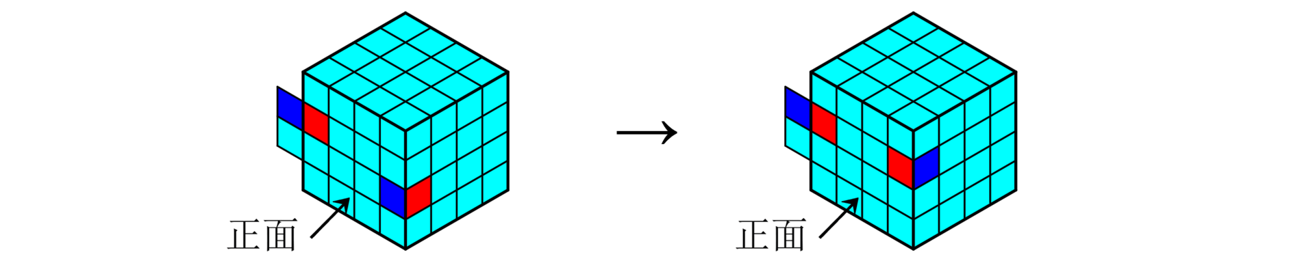 - 若最后一个块位于与第一个面相邻的面上,则将这两个面旋转为下图所示的位置,使用公式3-1还原。